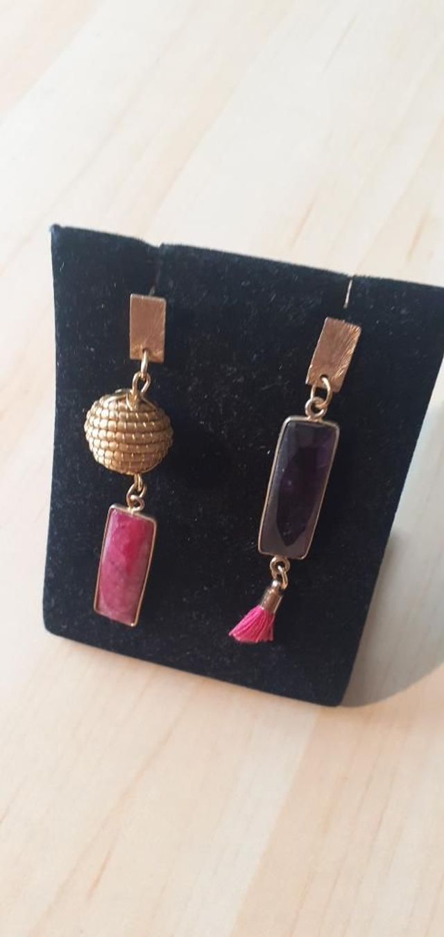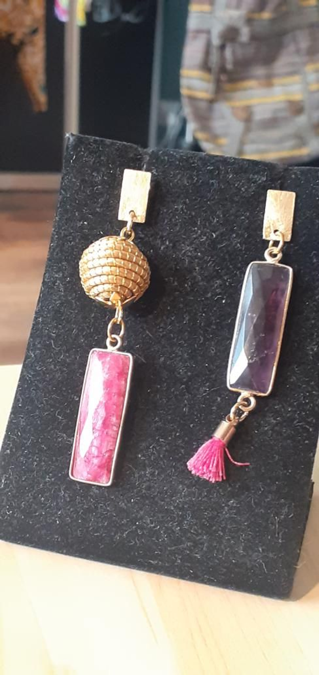 A vous de jouer ! Double jeu, Langues boucles bicolores, Fermoirs en Argent 925, dorés a l'or 18cts , orné de 2 pierres, Racine de ruby et améthyste serties en argent doré a l'or fin. Et son pompom rose fushia.