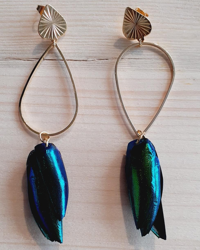 Super.Boucles de la.collection hybrid, assymetriques ornées d elytres de scarabées, couleurs naturelles, dores à l'or fin..fermoirs a vis plaqués or 18cts. Très légères, porce unique.